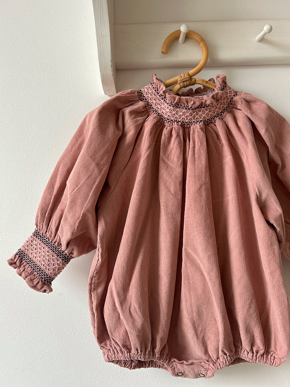 Smocking Style Romper, featuring bubble body, high frill neck, in a beautiful Indie Pink.