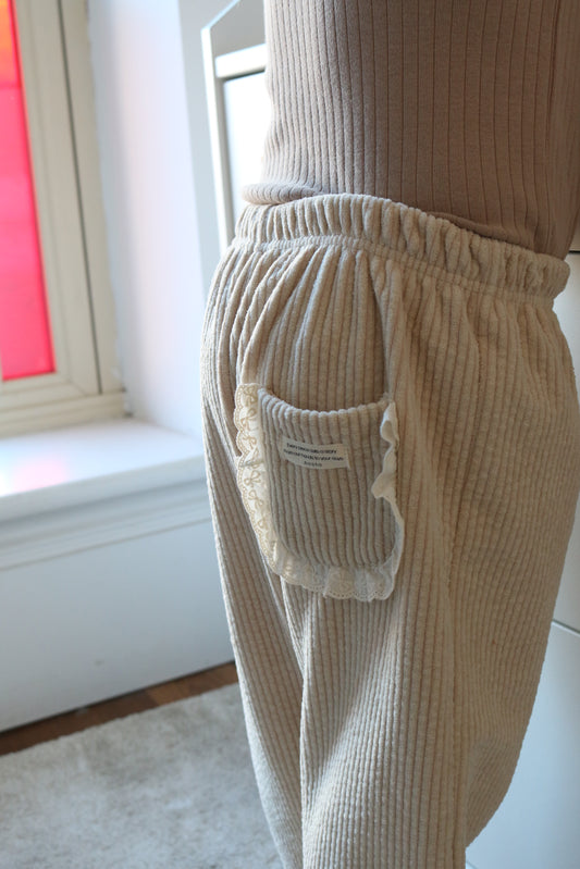 BEIGE CORDUROY TROUSERS WITH BRODERIE FRILL