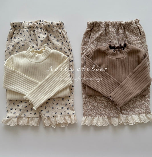 BROWN FLORAL PRINT TROUSERS WITH BRODERIE FRILL