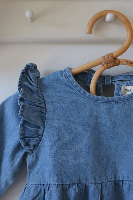 BLUE CHAMBRAY RUFFLE ROMPER