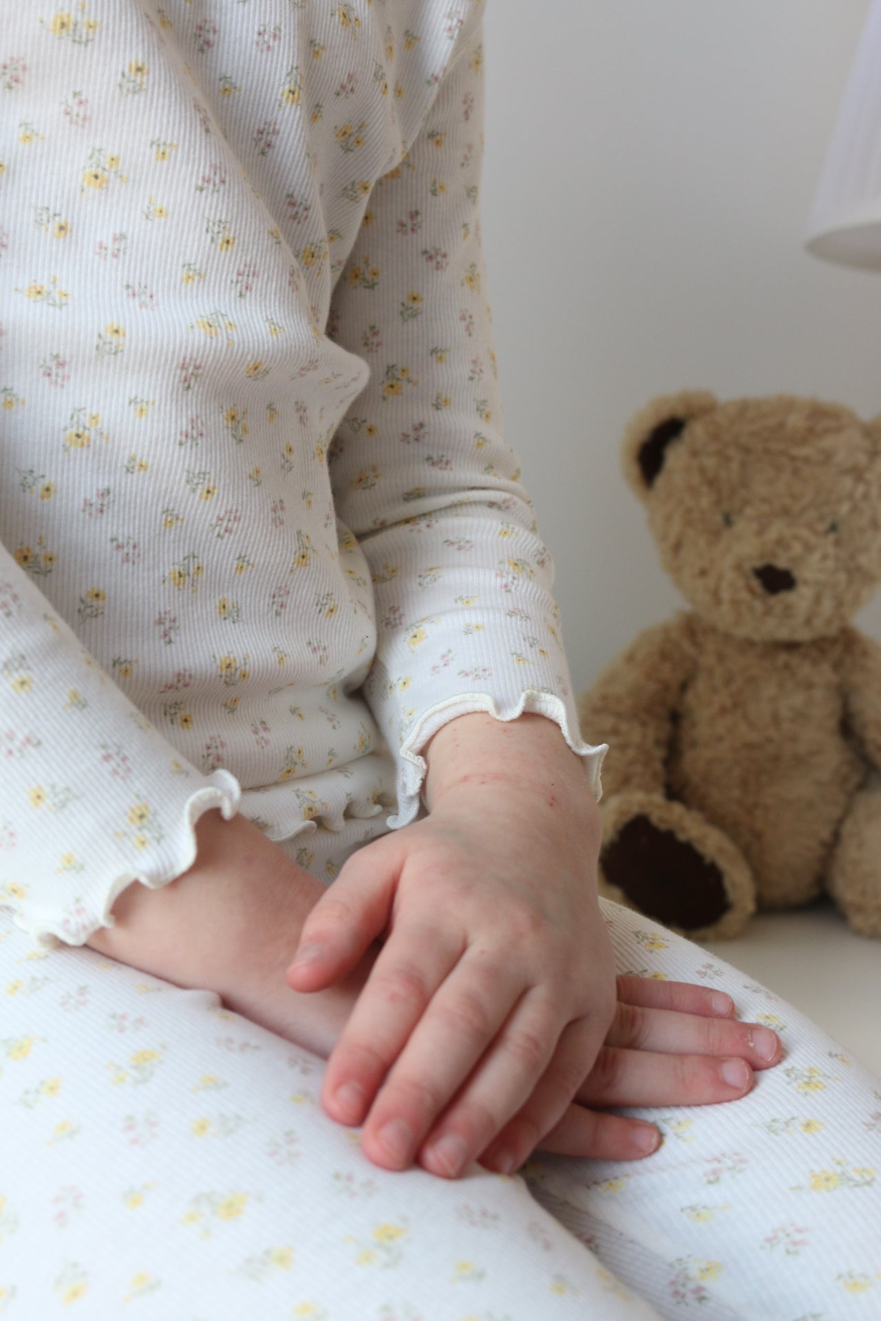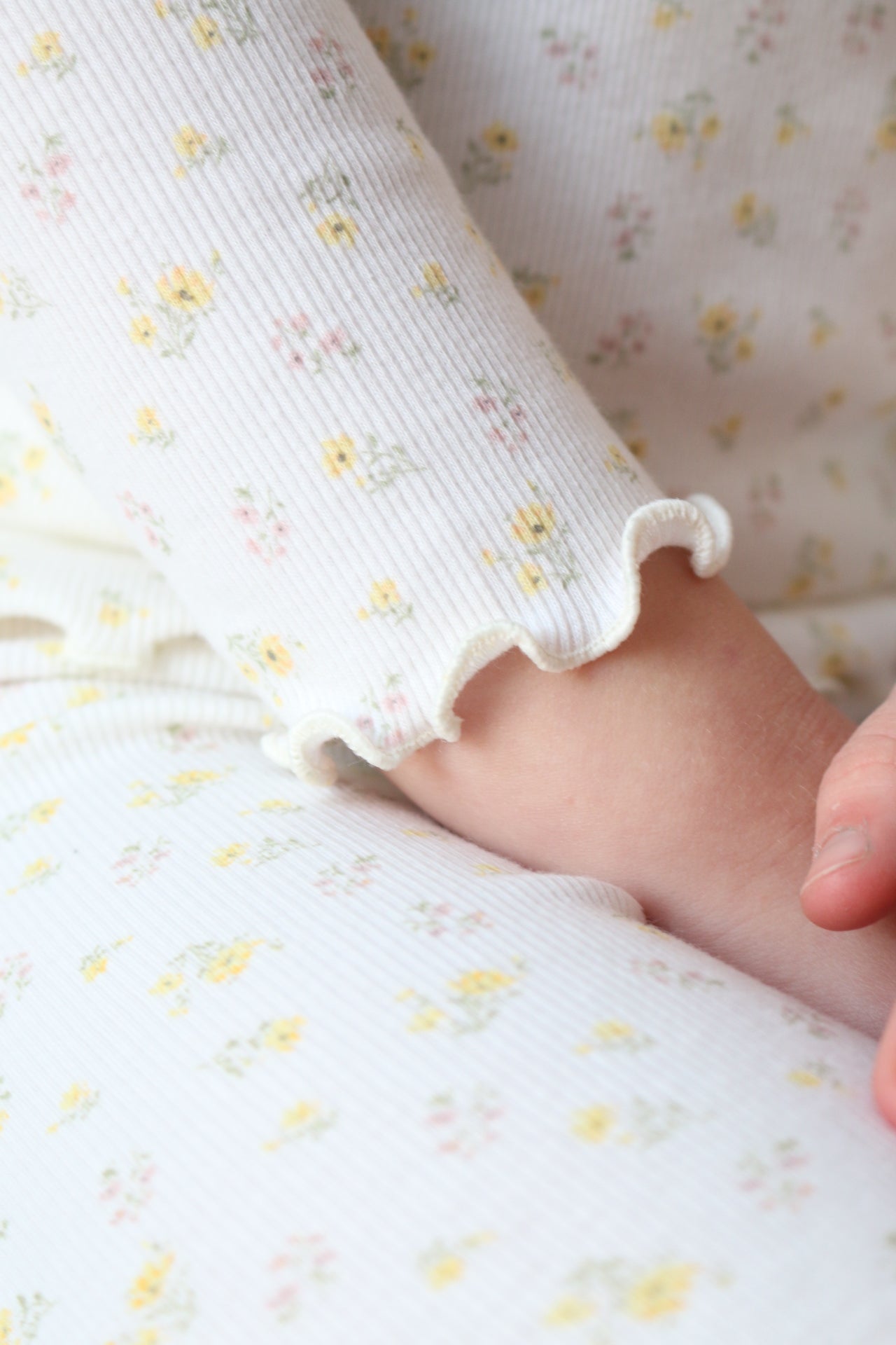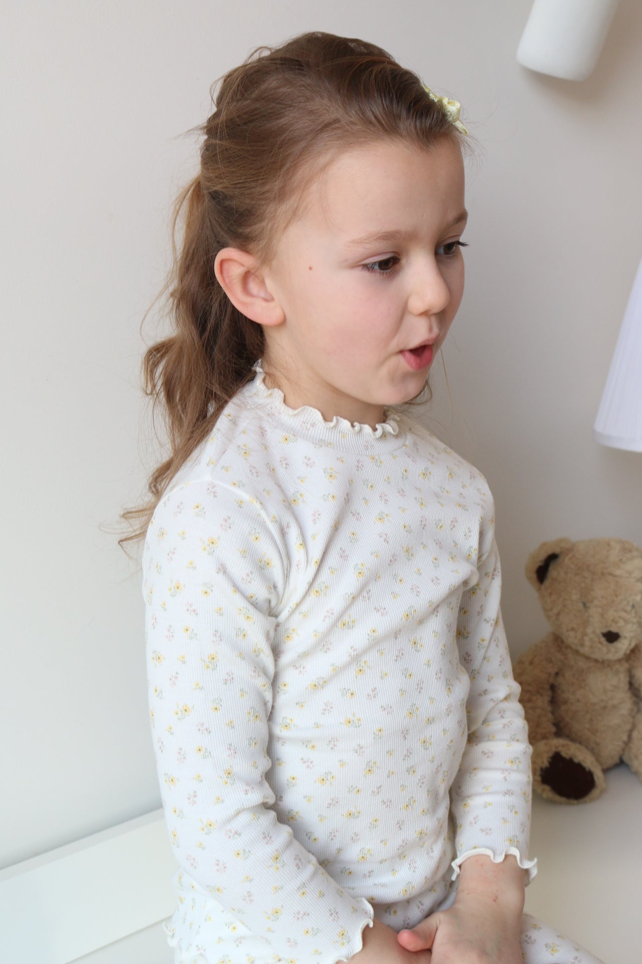 DAINTY FLORAL RIBBED COTTON FRILLED NECK TOP