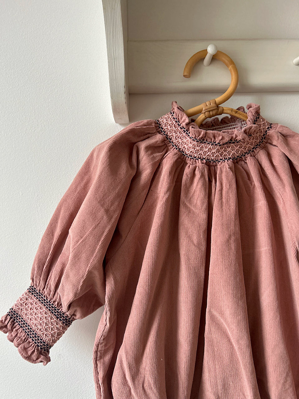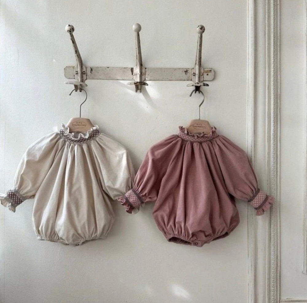 Smocking Style Romper, featuring bubble body, high frill neck, in a beautiful Indie Pink.
